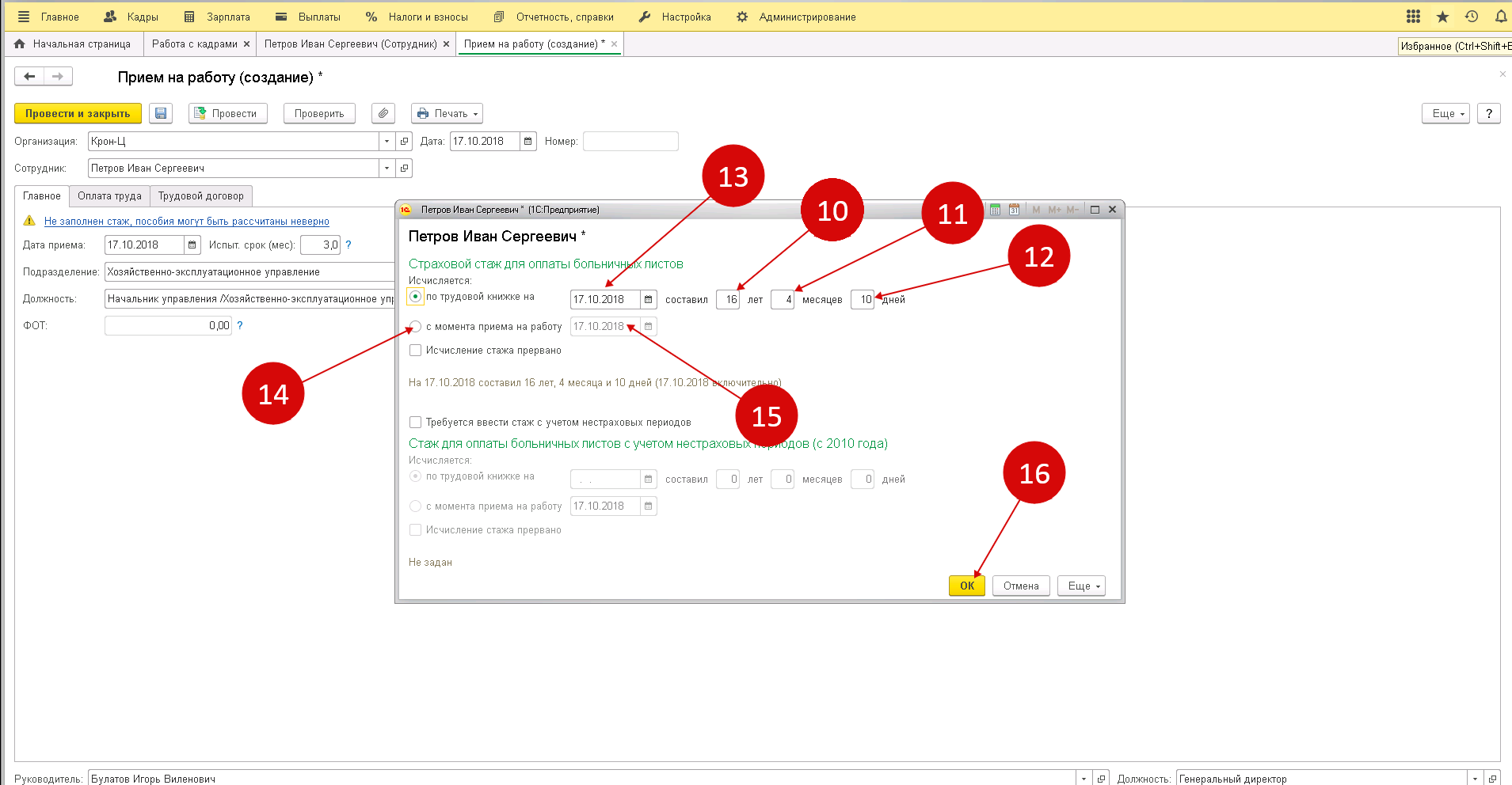 В новом окне укажите, сколько лет (10), месяцев (11) и дней (12) составляет трудовой стаж нового сотрудника, по состоянию на дату приема (13). Если у работника нет трудового стажа, кликните на кнопку «с момента приема…» (14) и укажите дату приема на работу (15). Для сохранения данных нажмите кнопку «ОК» (16). После этого ссылка «Не заполнен стаж…» исчезнет.