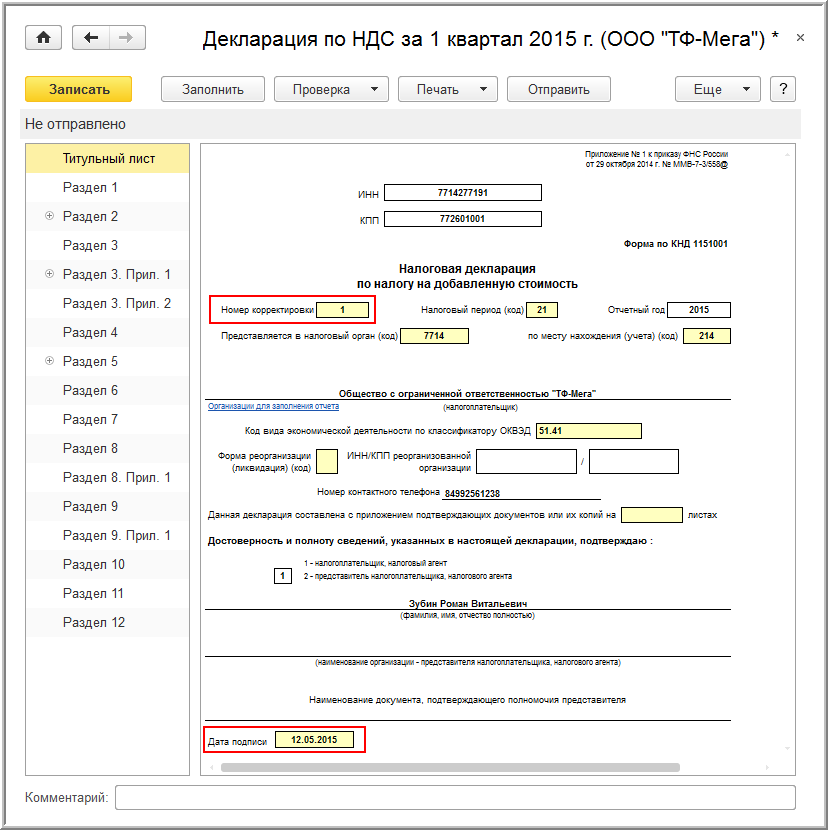 12) уточненной декларации необходимо обратить внимание на правильное указание номера корректировки. Так как представляется первая уточненная декларация, то в поле Номер корректировки указывается значение «1»