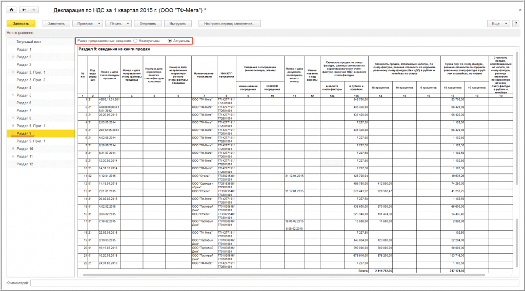 - проставляет отметку Актуальны (соответствует признаку актуальности «1»), если повторно сведения из этих разделов в налоговую декларацию выгружаться не будут;