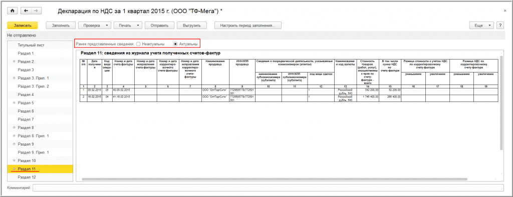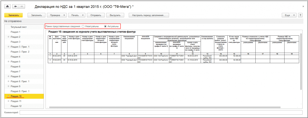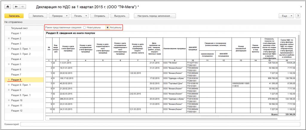 Если налогоплательщик все-таки пожелает повторно выгрузить в составе уточненной декларации все сведения из раздела 8, то он должен проставить отметку для значения Неактуальны (рис. 15).