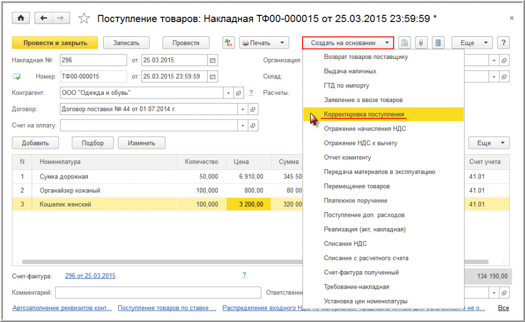 Исправление производится при помощи пункта «Корректировка поступления». Здесь нужно указать два параметра:
