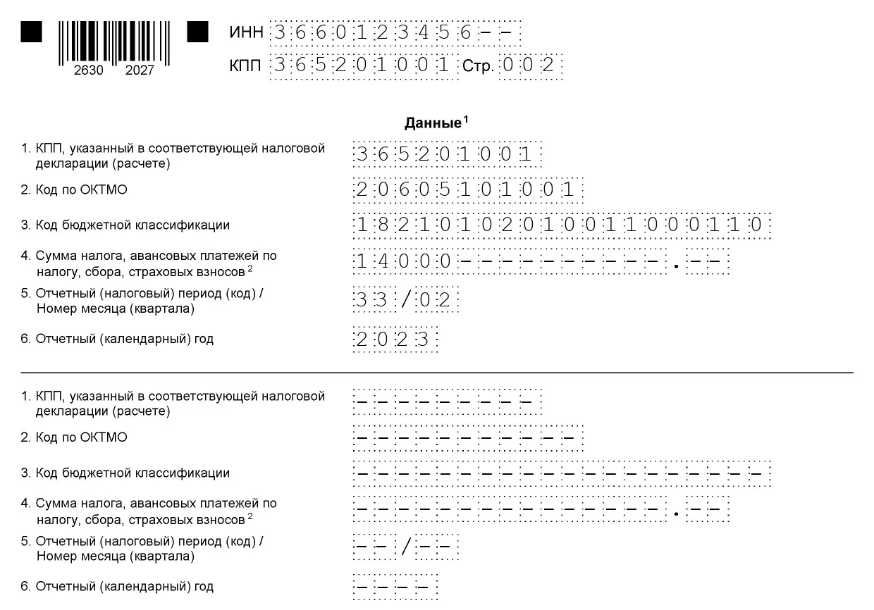 В разделе «Данные» можно указать сведения о нескольких налогах и взносах. Например, в уведомление по НДФЛ можно внести данные по НДС и страховым платежам. На каждом листе есть четыре одинаковых блока для этих сведений. При необходимости предприниматель может распечатать дополнительные страницы. Главное — не забыть пронумеровать их и указать общее количество страниц на титульном листе.