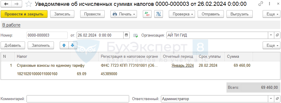 Мы рассмотрели, как создать и отправить в ИФНС уведомление об исчисленных страховых взносах за январь 2024.