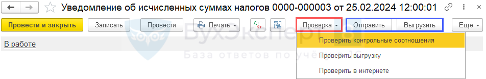 - сделайте проверку контрольных соотношений (Письмо ФНС от 29.11.2023 N ЕА-4-15/14981@) в Уведомлении об исчисленных суммах налогов по кнопке Проверка.