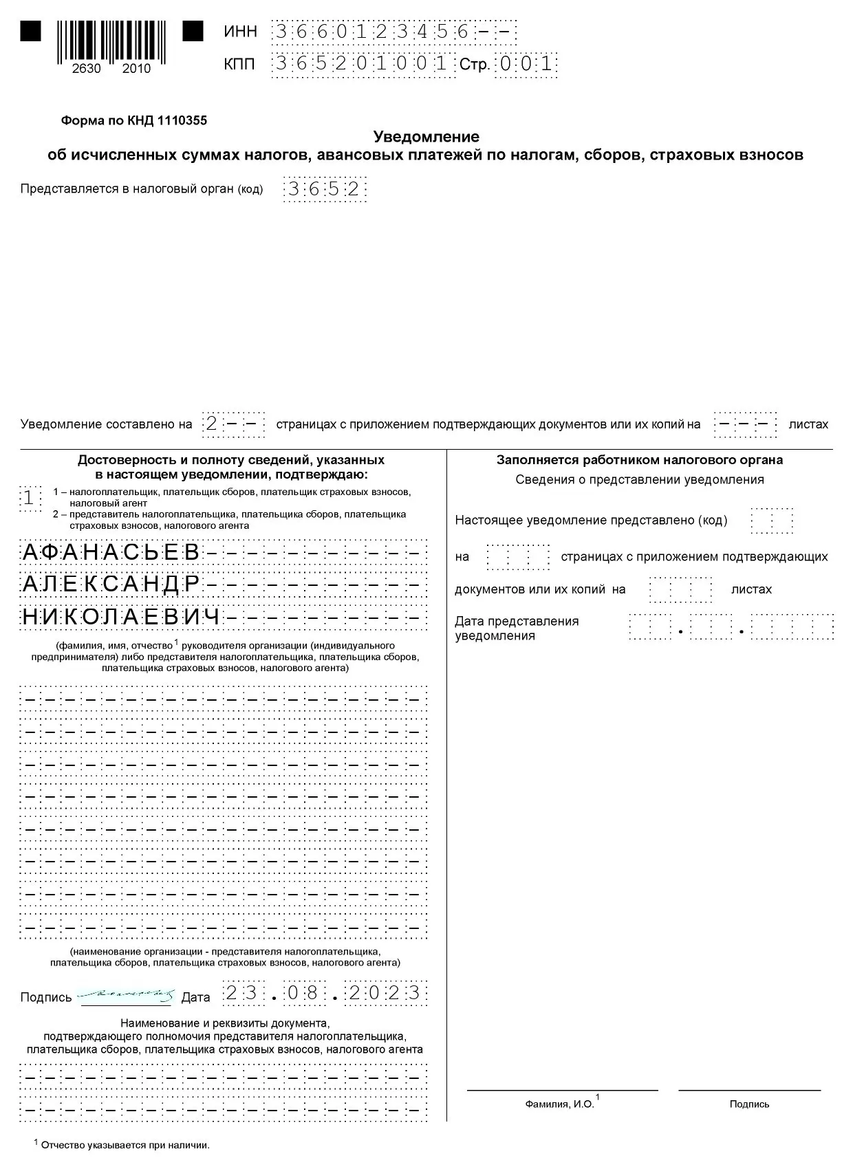 | Бланк уведомления об исчисленных суммах налогов, сборов, взносам в 2023 году |