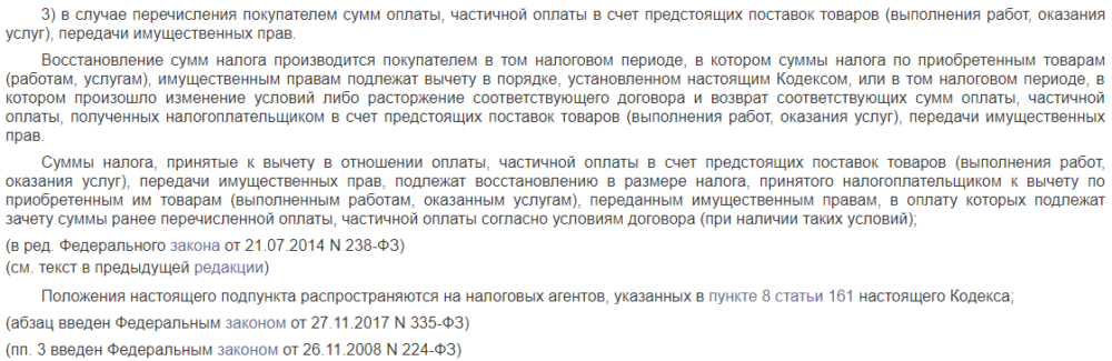 Однако, нормы Налогового кодекса РФ, а конкретно, подпункт 3 пункта 3 статьи 170 этого документа, не содержат указания на возможность восстановления НДС в такой ситуации. Считается, что в НК РФ приведен полный список ситуаций, в которых допустимо восстановление налога на добавленную стоимость. Требование о восстановлении НДС при списании дебиторок признается неправомерным, в том числе и судебными инстанциями.