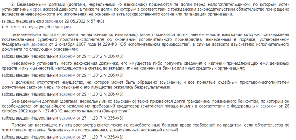 Согласно НК РФ дебиторская задолженность признается безнадежной, если хотя бы одно из перечисленных ниже условий выполняется (НК РФ, ст. 266-2):