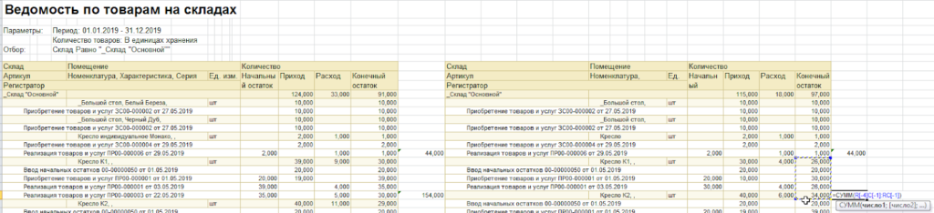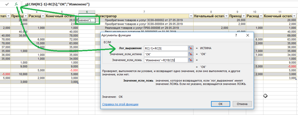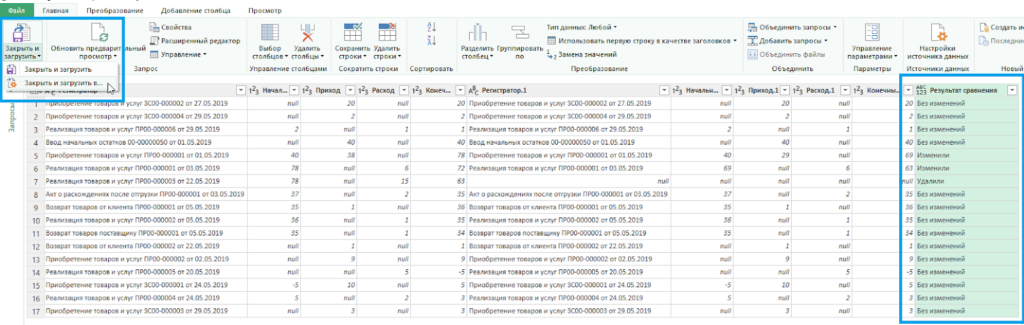 3. Если значения колонок «Конечный остаток» и «Конечный остаток1» не равны, значит данные «Изменили».