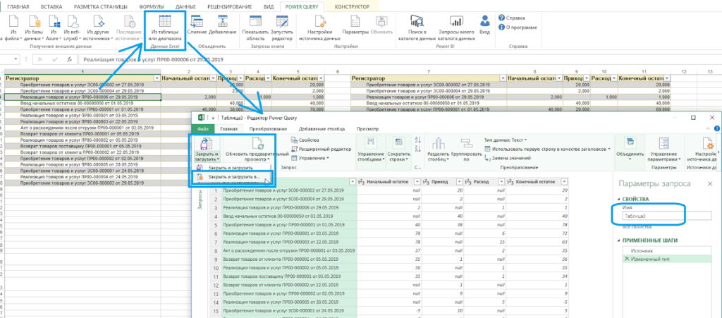 Вы снова попали в «Редактор Power Query». Здесь обе таблицы объединены в одну путем слияния указанных столбцов. В «Свойствах» задайте имя новому документу — раскройте крайнюю правую колонку, нажав на иконку