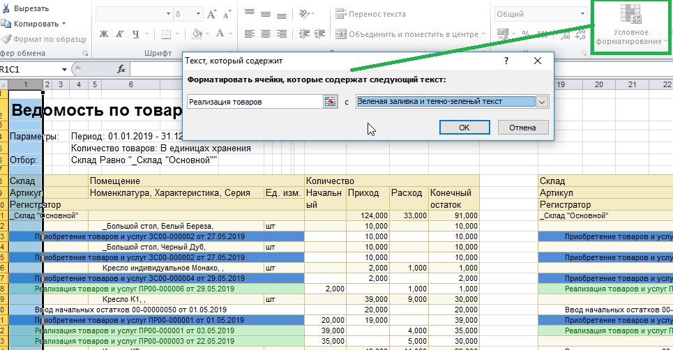 4. Задаем условие в поле «Лог-выражение». На скрине-примере условие следующее: если значение ячейки по колонке «Конечный остаток» левой таблицы равен значению ячейки по колонке «Конечный остаток» справа.
