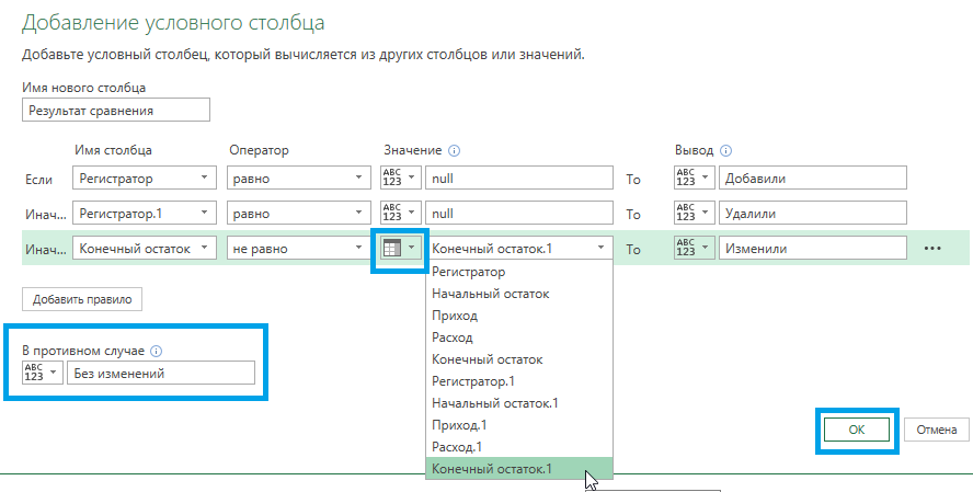 Следующий этап — вывести отличия таблиц в отдельную колонку. На вкладке «Добавление столбца» выберите «Условный столбец». В окне настройки задайте «Имя нового столбца» и проставьте условия сравнений колонок и какой вывод должен отразиться при их соблюдении. Правил можно задавать неограниченное количество с помощью команды «Добавить правило».
