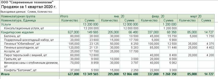 На рисунке 1 представлен отчет о продажах по номенклатуре в количественном и суммовом выражении за I квартал 2020 года, сгруппированный по номенклатурным группам и проданным товарам и услугам.