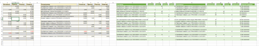 В скрине-примере видно, что гораздо больше итогов с выводом «отличаются», что не соответствует действительности — некоторые строки с одним и тем же регистратором не располагаются друг напротив друга. Выбранная функция этот момент не контролирует, поэтому вышли ложные результаты. Чтобы исключить такие ошибки, прежде чем использовать формулу, необходимо обе таблицы вручную откорректировать и проставить строки с одним и тем же регистратором в одну линию.
