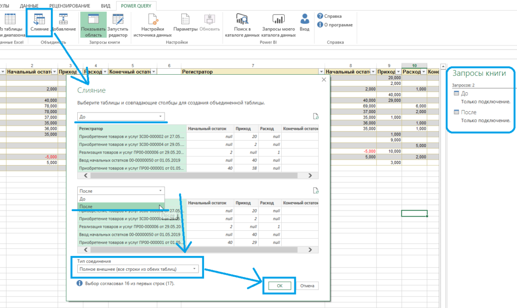 В правой части окна появились два запроса с указанными именами таблиц. На панели инструментов выберите команду «Слияние» и укажите поочередно созданные запросы. По одному разу в каждой части окна кликом выделите колонки, по которым нужно объединить файлы. Тип соединения «Полное внешнее (все строки из обеих таблиц)». Кликните на «ОК».