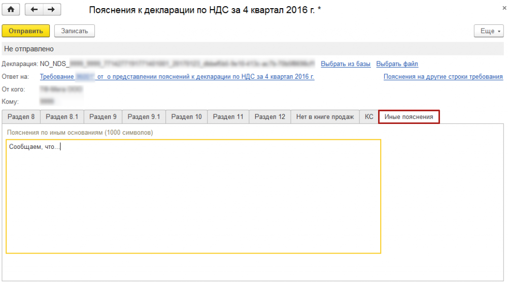 На вкладке Иные пояснения можно представить любую текстовую информацию, поясняющую те или иные несоответствия (расхождения), выявленные при камеральном контроле: