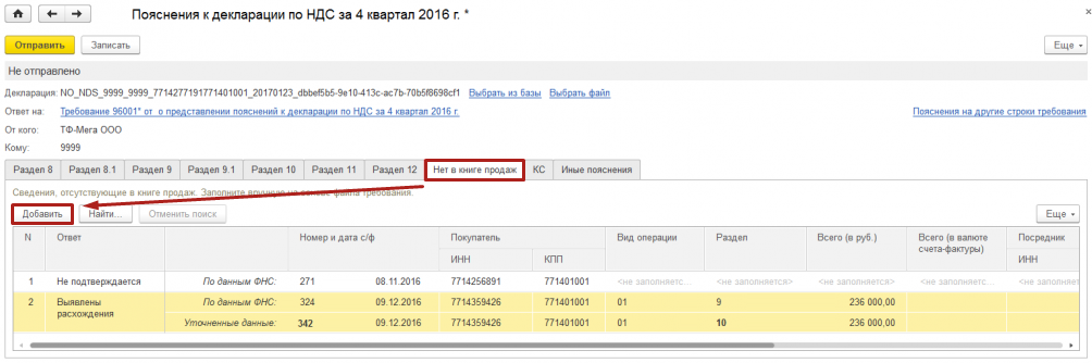 Например, в случае отсутствия в Разделе 9 налогоплательщика регистрационной записи по счету-фактуре, по которому контрагентом была отражена соответствующая регистрационная запись в разделе 8 налоговой декларации, на вкладке Нет в книге продаж: