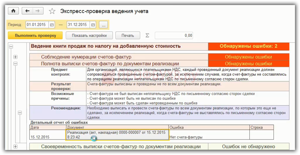 Ошибка «Полнота выписки счетов-фактур по документам реализации» означает, например, что не выписана накладная. Или выписка счет-фактуры осуществлена в другой программе, например 1С Торговля и склад и не занесена в 1С 8.3 Бухгалтерия 3.0: