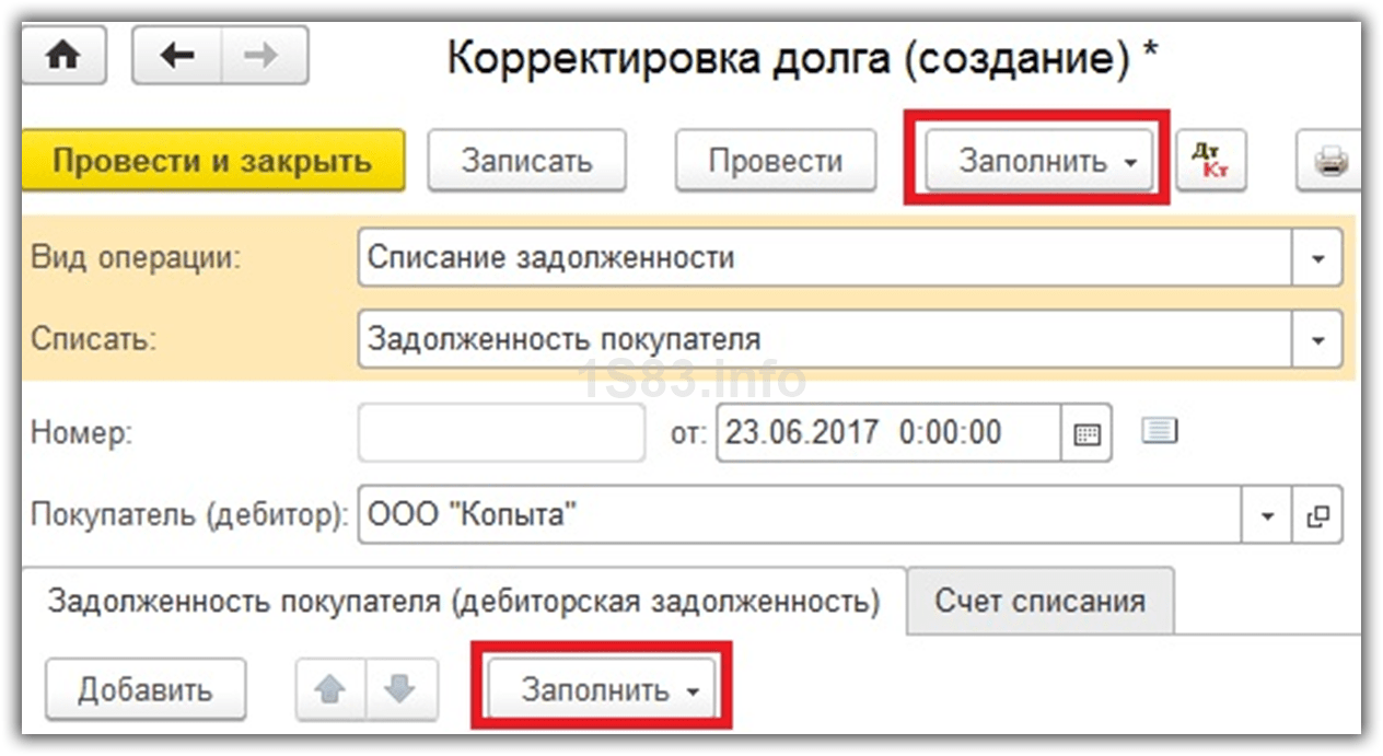 | 1 | Открыть форму «Списание задолженности» |