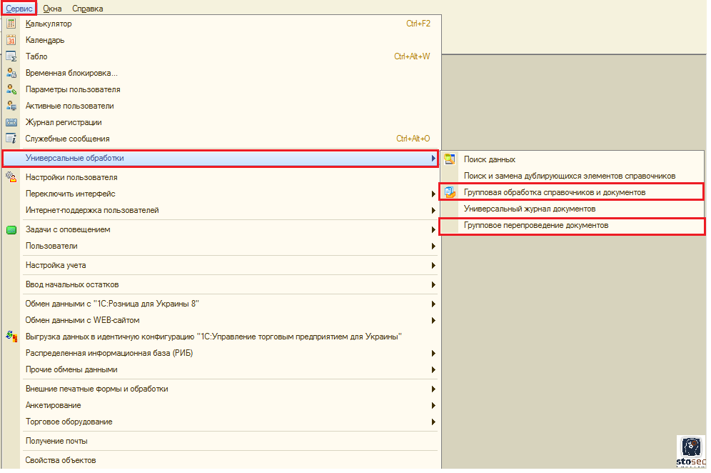 7.1 С помощью раздела «Универсальные обработки» пользователь получает доступ к групповой обработке справочников и документов а также групповому перепроведению документов.