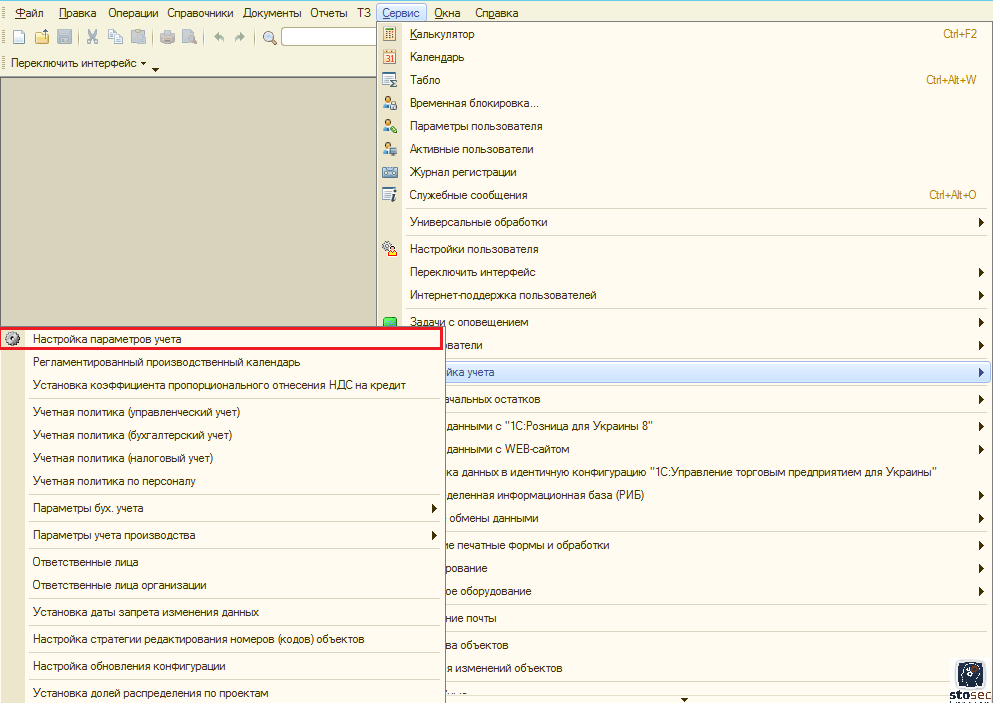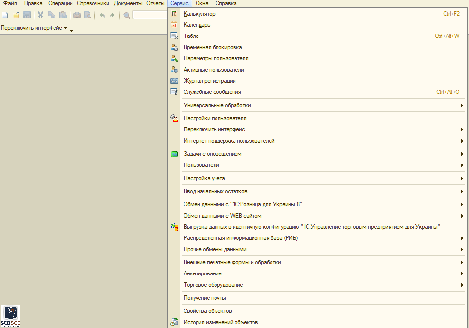 • Сервис . Это меню включает в себя команды, предназначенные для перехода в режим работы с сервисными функциями системы;