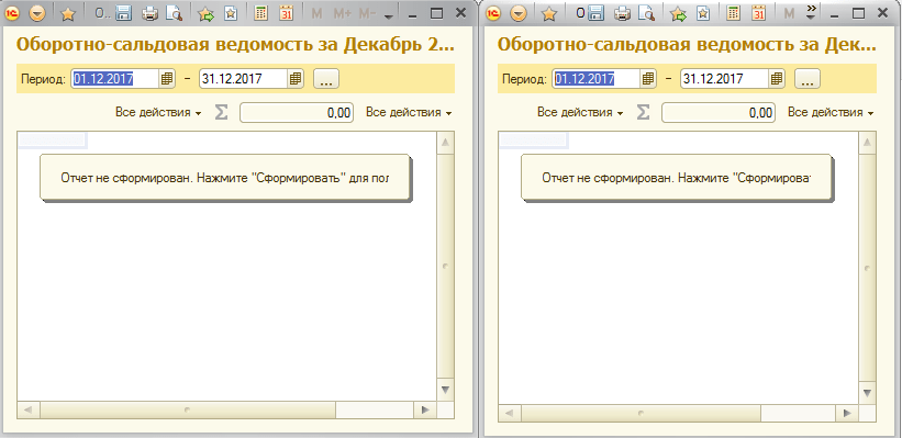 И сейчас я покажу как добиться того, чтобы два отчёта (например, 2 оборотно-сальдовые ведостомости) открылись в соседних (отдельных) окнах.