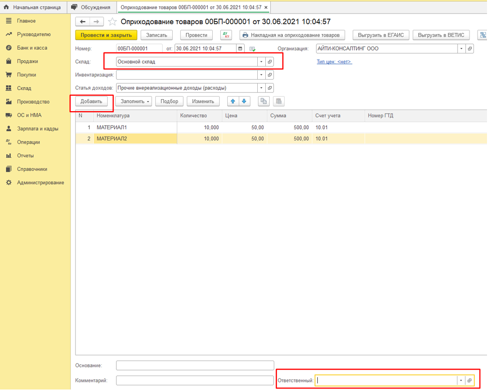 - Склад — из справочника Склады укажите место хранения, т.е. куда приходуются излишки ТМЦ;