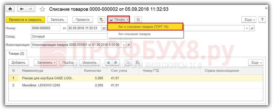 Выводим на печать Акт о списании товаров (ТОРГ-16), щелкнув по кнопке Печать: