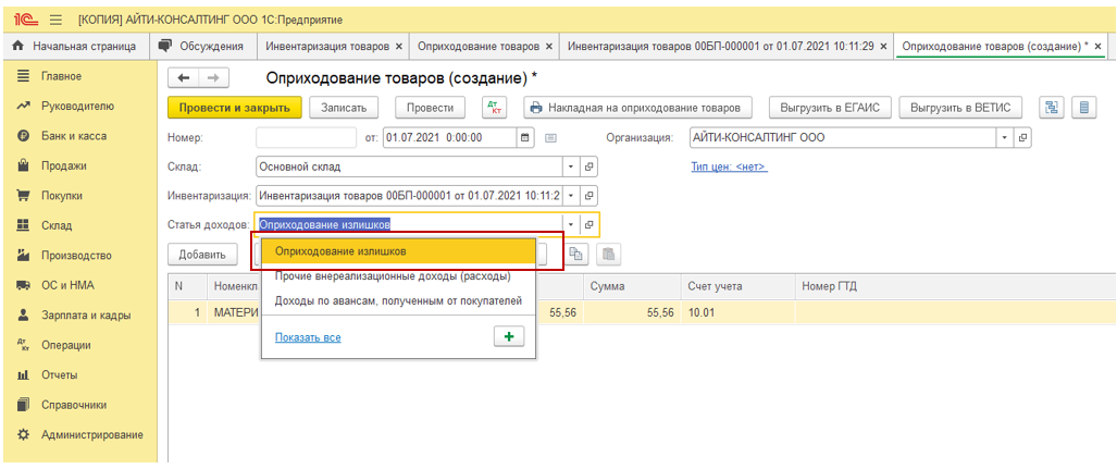 Инвентаризация товаров – Создать на основании – Оприходование товаров