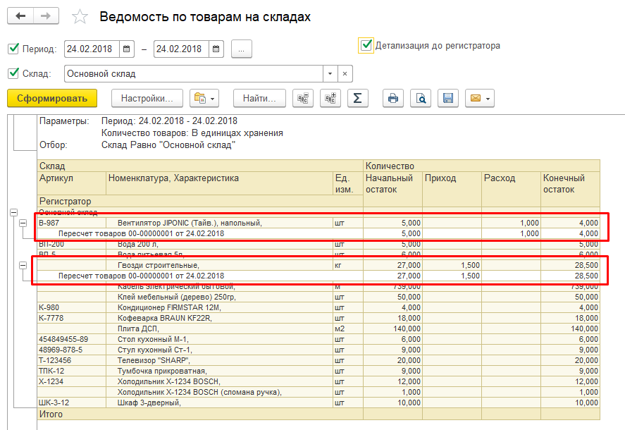 Сформировав ведомость по товарам на складах, видим что все операции выполнены корректно: