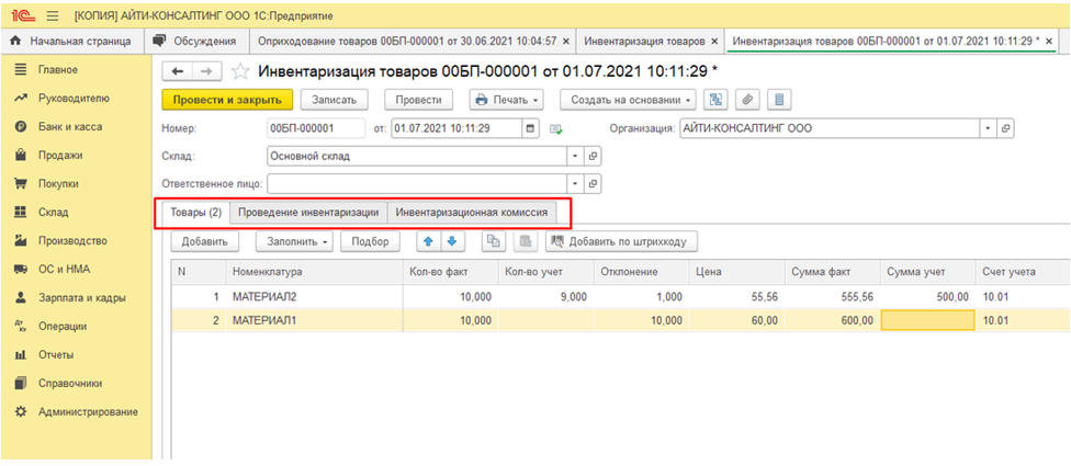 Документ «Инвентаризация товаров» содержит 3 вкладки: Товары, Проведение инвентаризации, Инвентаризационная комиссия.