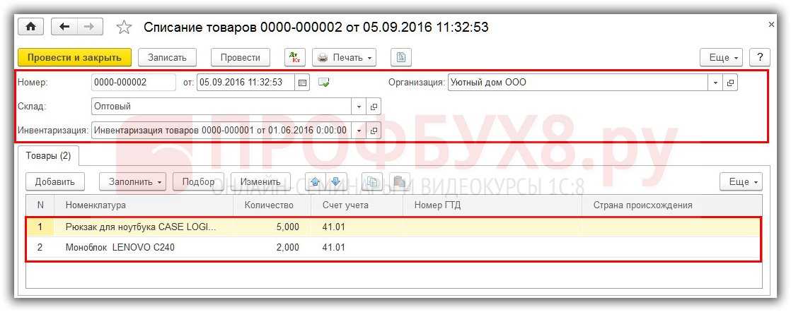 Шаг 2. Проведение документа Списание товаров