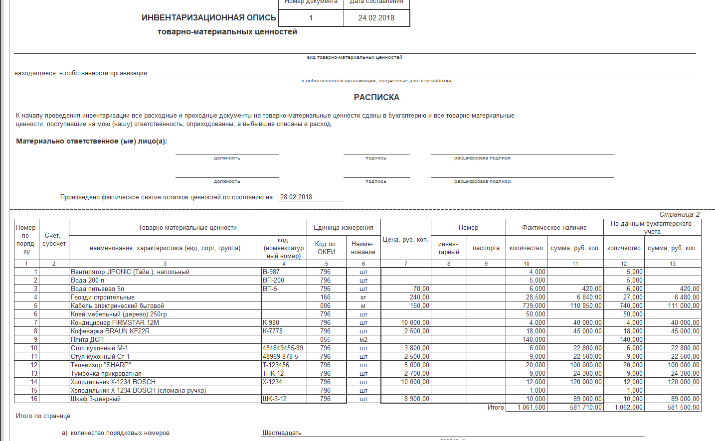 Предположим, что на торговом складе магазина №23 31 марта 2016 года была проведена инвентаризация. Ответственное лицо можно не указывать, как это мы и сделали, но при необходимости заполните его.