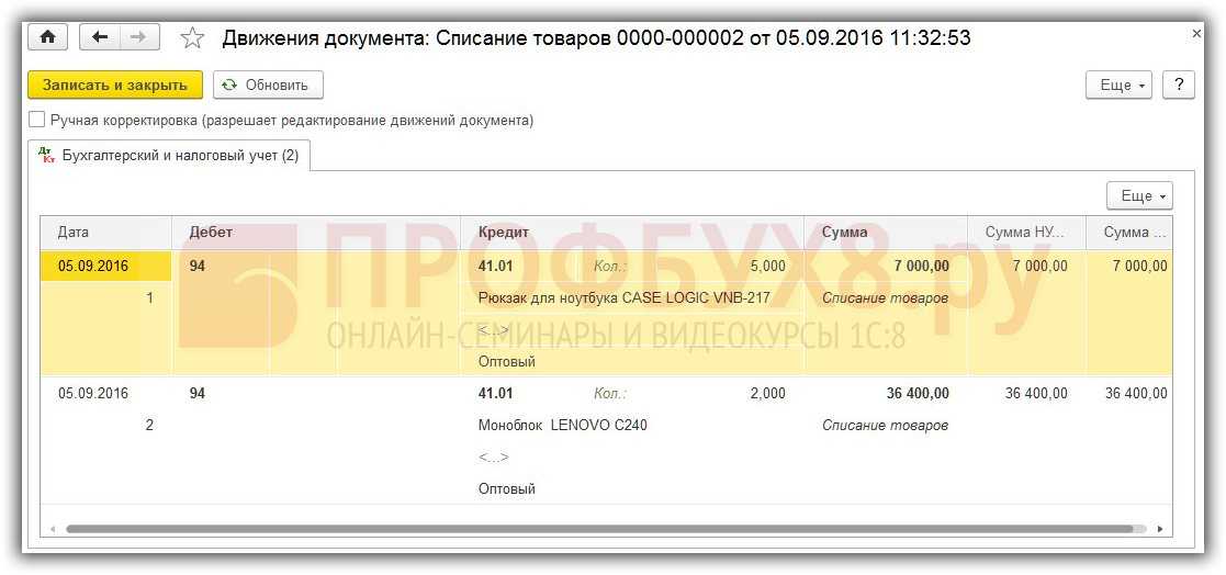 После проверки документ проводится, товары списываются со склада и формируются проводки: