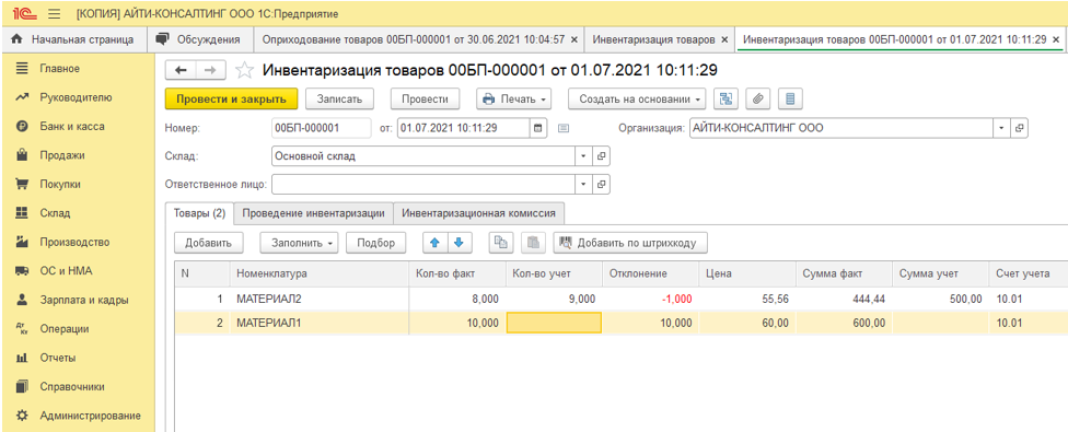 Недостача ТМЦ при инвентаризации в 1С 8.3