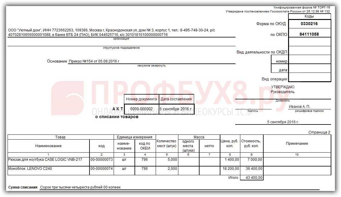 Образец Акта о списании товаров ТОРГ-16: