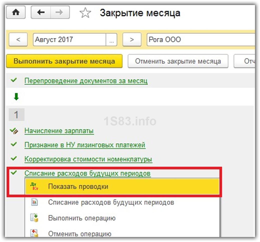 При закрытии августа 2017 г. (та как списание мы начинаем именно с этого месяца) в обработке «Закрытие месяца» появится пункт «Списание расходов будущих периодов». После того, как закрытие было произведено успешно, на него можно нажать и посмотреть произведенные проводки.