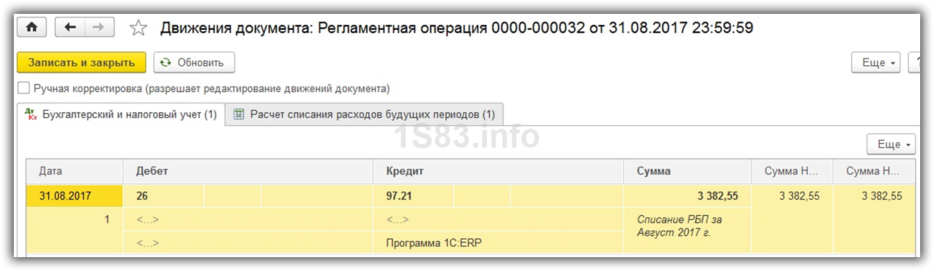 Как мы видим, со счета 97.21 на счет 26 списалась сумма за август 2017 года. Данная регламентная операция при закрытии месяца будет выполняться до августа 2019 года включительно.