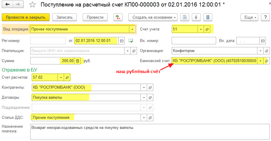 - Проводится документ об принятии средств на рублёвый счёт организации — от банка придёт, по сути, равный по стоимости эквивалент в рублях.