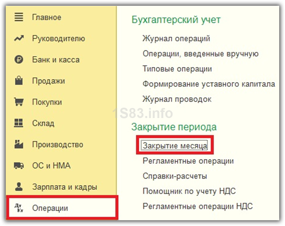Заходим в раздел «Операции» и выбираем там пункт «Закрытие месяца»