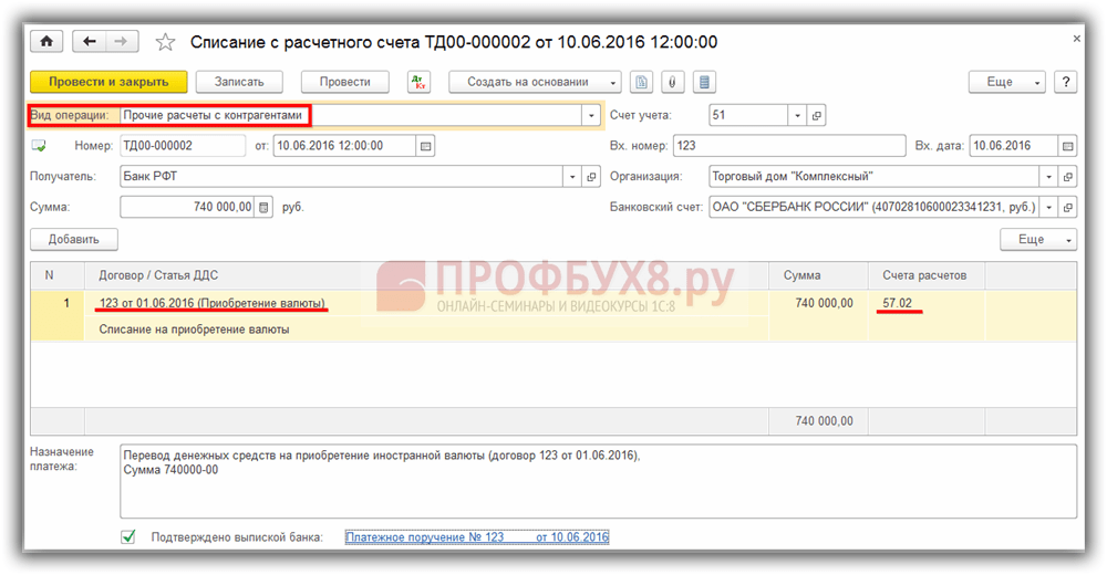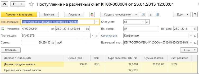 - счёт расчётов — обязательно проставляется 57.22 (это как раз продажа или покупка любой валюты).