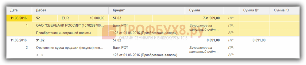 - Дебет 52 – Кредит 57.02: отражена оценённая в рублях по курсу Банка России (на 11.06.2016г.) купленная иностранная валюта (10 000,00 евро) (10 000,00 евро * 73,1909 руб./евро + 731 909,00 руб.).