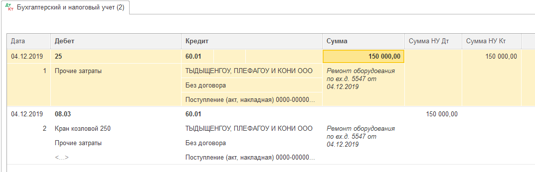 Попробуем отразить в 1С. Нам снова нужно сформировать акт «Поступление услуг». Алгоритм схож: указываем номенклатуру, счет 26, но теперь в налоговом учете по дебету выбираем счет 97.21 (прочие расходы будущих периодов).
