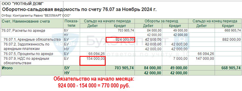 На 01 ноября остаток арендного обязательства — 770 000 руб. Именно на эту сумму начисляются процентные расходы.