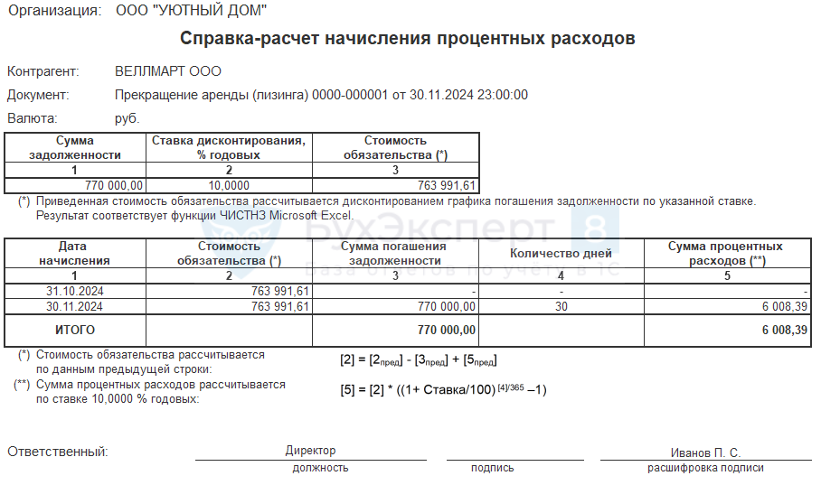 Распечатайте Справку-расчет начисления процентных расходов по кнопке Печать документа Прекращение аренды.