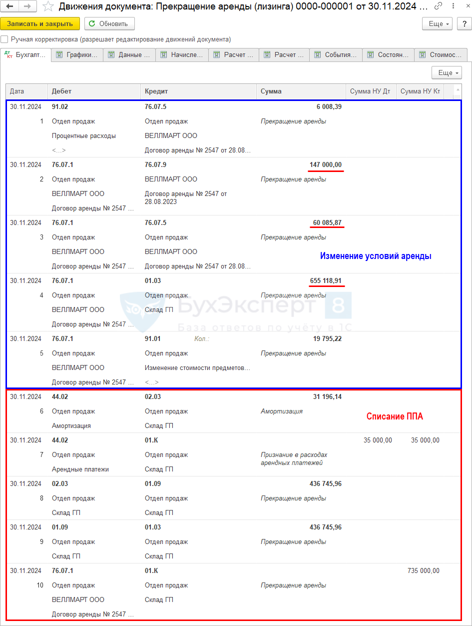 - Дт 76.07.1 Кт 01.03 — уменьшение стоимости ППА и арендных обязательств в БУ;
