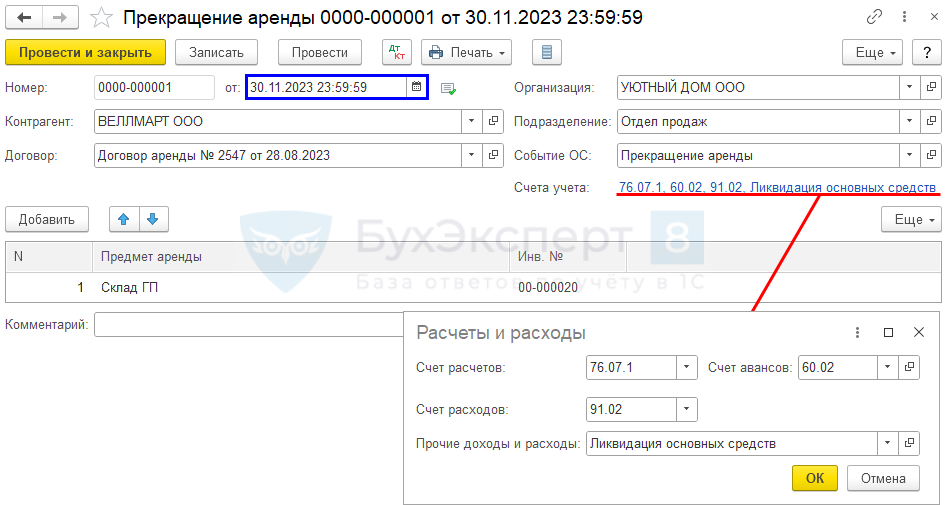Введите документ Прекращение аренды в разделе ОС и НМА – Прекращение аренды.