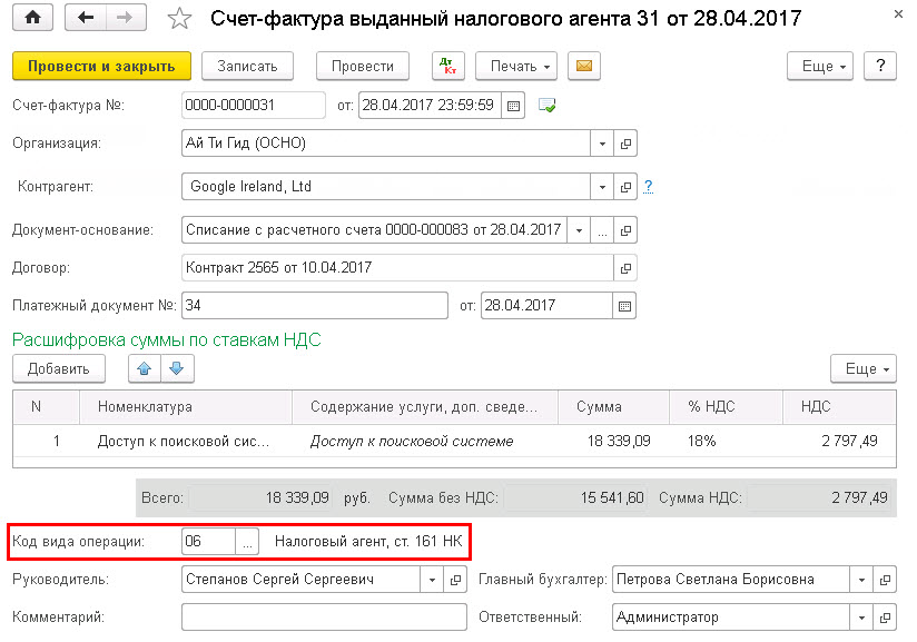 регистрация счета-фактуры налогового агента. Код вида операции “06”.
