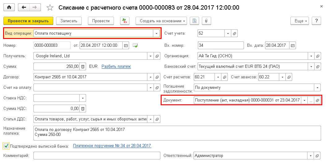 Оплата иностранному поставщику в 1С 8.3 оформляется документом “Списание с расчетного счета” вид операции “Оплата поставщику”: