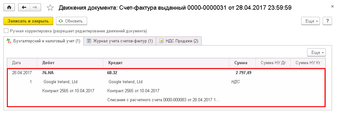 - Сформировать счет-фактуру на вознаграждение. Не забыть проверить проводки для корректного отражения выручки и НДС.
