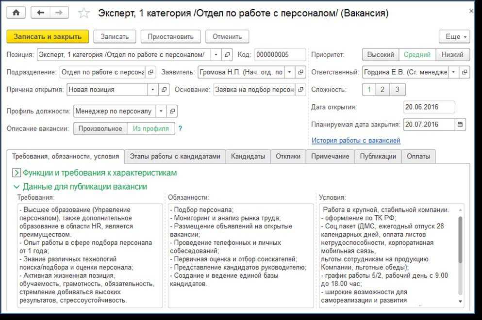 Рис.12. Вкладка «Вакансия» в программе «1С:ЗУП 8.3»